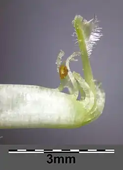 Vorne schief angeschnittene Staubfädenrinne und Griffel