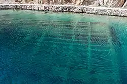 Auf dem Meeresgrund ist in wenigen Metern Tiefe das Wrack einer während des Zweiten Weltkrieges von britischen Jagdbombern versenkten Siebelfähre der Wehrmacht zu sehen.