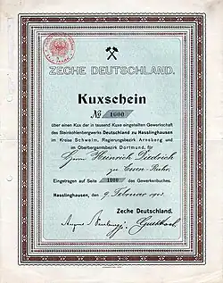 - ↑ a b c Gerhard Gebhardt: Ruhrbergbau. Geschichte, Aufbau und Verflechtung seiner Gesellschaften und Organisationen. Verlag Glückauf GmbH, Essen 1957
