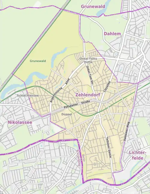 Der alte Ortskern von Zehlendorf liegt südlich von Dahlem und grenzt nach Osten an die Villenkolonie Lichterfelde-West, nach Westen an Nikolassee.