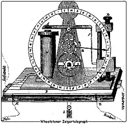Den ersten Zeigertelegrafen konstruierte Charles Wheatstone 1839; bei diesem Gerät konnte ein durch ein Uhrwerk betriebener Zeiger durch eine am Anker eines Elektromagneten angebrachte Hemmungsvorrichtung von der entfernten Abgangsstation aus nach Belieben vor jedem der am Rande stehenden Buchstaben angehalten werden.