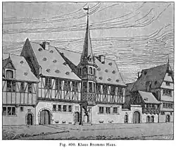 Die gleichen Gedanken beschäftigten wohl Klaus Bromm, einen reichen Patrizier, der fast genau in der Mitte der Zeil kurz nach 1541 seinen Wohnsitz errichten ließ. Durch seine Höhe und Breite sowie einen mittigen, spätgotischen Erker mit Spitzhelm, ganz ähnlich dem des nur wenig später erbauten Großen Engels am Römerberg, war das Gebäude seinerzeit wohl nicht nur ein inmitten der ansonsten vorstädtischen, kaum über zwei Stockwerke hinausgehenden Bebauung ungewöhnlicher Anblick, sondern auch ein erstes Zeichen für den beginnenden Wandel des Straßenzuges. Nach Norden besaß das Gebäude einen Treppenturm mit welscher Haube sowie einen bis fast an die Kleine Eschenheimer Straße stoßenden, tiefen Innenhof mit ebenfalls in frühen Renaissanceformen gestalteten Wirtschaftsgebäuden.[14]