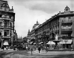 Zu den prächtigsten Bauwerken zählte der 1890–1891 errichtete riesige Bau der Frankfurter Hauptpost, für den wiederum das Rote Haus und der Russische Hof weichen mussten. Mit letzterem verlor die Stadt den bedeutendsten Profanbau des frühen Klassizismus, was schon Zeitgenossen teils heftig kritisierten.[44] Der Neubau war von einer stadtbildprägenden Kuppel gekrönt, an beiden Enden der breiten Straßenfront befanden sich Ecktürme mit weiteren Kuppeln. Die posteigene Straßenbahnlinie fuhr durch einen großen Torbogen in den Innenhof, wo die von den Postbahnhöfen am Hauptbahnhof und Ostbahnhof angelieferten Briefe ausgeladen wurden.