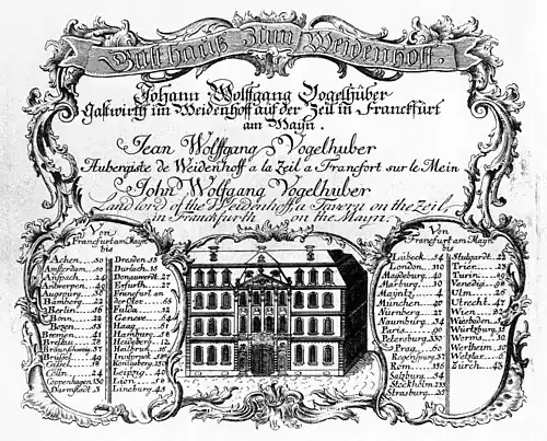 Das mit Abstand älteste bekannte und zugleich eines der vornehmsten Gasthäuser war der Weidenhof am westlichen Ende der Zeil, der 1610 das erste Mal urkundlich als solcher erwähnt, 1628 neu erbaut und im 18. Jahrhundert mehrfach in den schnell wechselnden Stilabfolgen umgestaltet wurde. Er ist auf besonders enge Weise mit der Frankfurter Stadtgeschichte verbunden, da Johann Wolfgang Goethes Großmutter, Cornelia Walther, mit dem Pächter des Weidenhofs verheiratet war. Als dieser 1705 starb, heiratete Goethes Großvater Friedrich Georg Göthe in zweiter Ehe ein und übernahm das Gasthaus, mit dem er bis zu seinem Tod im Jahr 1730 ein Vermögen erwirtschaftete. Er legte damit den Grundstock für die Wohlhabenheit der Familie Goethe, die noch seinem berühmten Enkel die finanzielle Unabhängigkeit sicherte.[23]