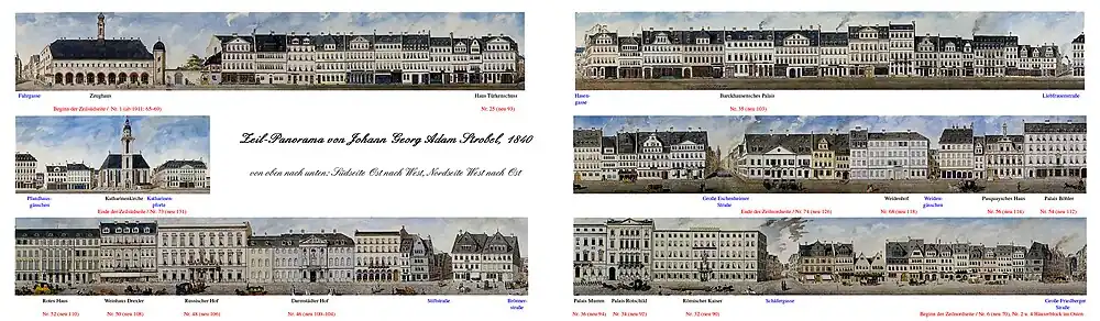 Zahlreiche zeitgenössische Beschreibungen dokumentieren den hervorragenden Ruf, den die Zeil in der ersten Hälfte des 19. Jahrhunderts hatte. So schrieb der Historiker und Stadttopograph Johann Georg Battonn schon um 1810: „Die Zeile ist ohne Widerrede die schönste Strasse der ganzen Stadt, sie hat ihre seltene Breite den Viehmärkten zu verdanken, die Raum erforderten und nicht zuließen, dass sie der alte Baugeschmack in engere Gränzen brachte. Ihre prachtvollen Gebäude ziehen die Bewunderung der Fremden an sich, und überzeugen sie von dem Reichthum der hiesigen Bürger.“[38]