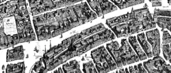 Doch nicht nur die Ansprüche der Bürger an ihre Behausung änderten sich. Als zeitweise bedeutendste Messestadt Europas kamen in der Blütezeit der Messe, also dem späten 15. Jahrhundert bis zum Dreißigjährigen Krieg, zweimal jährlich jeweils über 10.000 Menschen für drei Wochen in die Stadt,[15] die noch bis tief ins 19. Jahrhundert hinein kaum mehr als 40.000 Einwohner hatte.[16] Seit 1562 war Frankfurt dann auch Krönungsstätte der Kaiser des Heiligen Römischen Reiches Deutscher Nation und hatte anlässlich einer jeden solchen Zeremonie den Hochadel des gesamten Reichs unterzubringen, der noch weit höhere Ansprüche stellte als die Messgäste.[17]