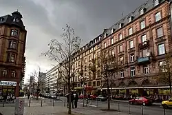 Vor allem an der ab 1874 bebauten Kaiserstraße mit ihrer großzügigen und einheitlichen Architektur im prachtvollen, wilhelminisch-historistischen Stil, aber auch am nur wenig später begründeten Opernplatz siedelten sich schnell die besten Hotels und Geschäfte der Stadt an, so dass die Zeil mit ihrem damals klassizistisch-biederen und vielfach noch kleinbürgerlich wirkenden Bauten weder funktional noch ästhetisch Schritt halten konnte.[41]