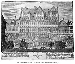 Der jedoch wichtigste Großbau des 17. Jahrhunderts an der Zeil entstand ungefähr zwischen 1635 und 1640 mit dem Roten Haus etwas westlich von Klaus Bromms Haus. Aufgrund spärlicher Quellenüberlieferung über das Vorhaben muss man sich an den wohl auf Erzählungen von Zeitzeugen fußenden Bericht des 1662 geborenen Stadtchronisten Achilles Augustus von Lersner halten, der schrieb, dass das Gebäude an Stelle von sechs mittelalterlichen Parzellen von einem Johann Porsch für über 32.000 Gulden errichtet wurde.[24]