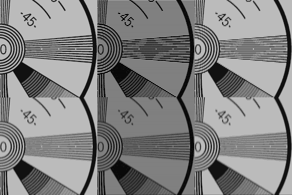 - Zeilenflimmern: Horizontale Kanten im Bild können unter Umständen scheinbar auf- und abtanzen, wenn die Kante genau zwischen zwei Bildzeilen fällt, da sie dann jeweils nur in einem der beiden Halbbilder sichtbar ist.