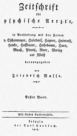 Die Zeitschrift für psychische Aerzte war eine psychiatrische Fachzeitschrift, die in fünf Jahrgängen von 1818 bis 1822 von Friedrich Nasse herausgegeben wurde. Zu den Autoren zählten unter anderem Claude-Louis Berthollet, Friedrich Groos, Alexander Haindorf, Christian August Fürchtegott Hayner, Johann Christian August Heinroth, Friedrich Nasse, Ernst Gottlob Pienitz, Eduard Percival, Richard Powell, Kurt Sprengel, Friedrich Schiller.[1] Nachfolger der Zeitschrift waren die Jahrbücher für Anthropologie. Ab 1844 erschien die Allgemeine Zeitschrift für Psychiatrie.