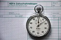 Die Zeitstudie oder auch Zeitaufnahme ist laut REFA[1] eine Methode der Zeitermittlung und bezeichnet das Ermitteln von Sollzeiten durch Messen und Auswerten von Istzeiten mit Hilfe eines Zeitaufnahmegeräts. Das im deutschsprachigen Raum gängigste Verfahren ist die Zeitstudie nach der REFA-Methodenlehre. Im jeweiligen regionalen Entgelt-Rahmentarifvertrag der Metall- und Elektroindustrie sind zur Zeitstudie und anderen Methoden der Datenermittlung für die Zeitwirtschaft detaillierte Regelungen vereinbart.