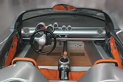 Das Chassis ist ein Monocoque aus fließgepressten Aluminiumprofilen mit zwei integrierten Überrollbügeln. Die zweisitzige Roadsterkarosserie besteht aus GFK. Durch zwei seitliche Einschnitte, die sich von der Mitte der Türen und bis zu den Kotflügeln ziehen, erhält der Motor die Kühlluft. Die Frontscheibe ist auffallend flach. Oben auf dem Scheibenrahmen ist ein zweiteiliger Rückspiegel angebracht. Das Armaturenbrett trägt fünf Rundinstrumente; der Boden ist mit Holz vertäfelt.
