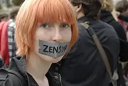Ein immer wichtiger werdendes Thema nach der Jahrtausendwende war das Internet – konkret die Debatte um Online-Inhalte, die damit verbundenen Urheberrechte sowie die Frage der Anonymität im Internet. Einerseits forderten Kritiker einer schrankenlosen Freiheit hier regulierende Eingriffe. Andererseits zeigte sich in zahlreichen Fällen, dass Online-Medien auf ausgeübten Druck anfälliger reagierten als etablierte Print-Medien.[116] Besondere Brisanz entfaltete das Internet als Hauptschauplatz spezieller Straftatbestände – insbesondere in Sachen Kinderpornografie und in Form von Werbeseiten für den militanten Islamismus. Diskussionen, das Reglement zu verschärfen, endeten aufgrund der kontrovers geführten politischen Debatte bislang im Patt. In dieser Debatte wurde auch über das am 1. Dezember 2011 ohne vorherige Anwendung aufgehobene Zugangserschwerungsgesetz gestritten[117] sowie über die Vorratsdatenspeicherung, die durch die mit ihr einhergehende Gefährdung des Informantenschutzes ebenfalls als Einschränkung der Pressefreiheit gedeutet wird.[118][119] Anlässlich einer Demonstration im Rahmen eines internationalen Aktionstages in Berlin 2009 bezeichnete die Linke-Politikerin Petra Pau die Vorratsdatenspeicherung als „unsinnig“ und warnte vor einem präventiven Sicherheitsstaat.[120] Weiterhin wurde diskutiert, inwieweit die Erschwerung des Zugriffs auf Internetinhalte nicht ebenfalls zensurähnliche Auswirkungen habe.[121] Im Gefolge dieser Diskussionen bildeten sich unterschiedliche Gruppen, die – als kleinster gemeinsamer Nenner – auf die Freiheit des Netzes verwiesen, wie die weltweit aktive Aktionsgruppe Anonymous. Brisanz – als Informationspool für unterdrückte, geheime oder nicht leicht zugängliche Informationen – bekam das Internet 2009/2010 auch durch die Aktivitäten der Plattform WikiLeaks[122] sowie einige deutsche Plattformen wie etwa GuttenPlag, die an der Aufdeckung plagiierter Dissertationen beteiligt waren.[123]