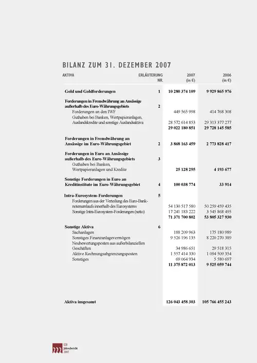 Unter dieser Bilanzposition sind im Wesentlichen die Gold- und die Währungsreserven einer Zentralbank zusammengefasst. Die Goldreserven dienten in der Vergangenheit vor allem zur Wertabdeckung der ausgegebenen Banknoten. Heute kann man die Goldbestände als Reserve für Krisenzeiten sehen. Aber auch das Vertrauen in die Wertbeständigkeit einer Währung hängt entscheidend von der Menge der Gold- und Devisenreserven einer Zentralbank ab. Es besteht jedoch die Gefahr, dass bei einem gleichzeitigen Goldverkauf mehrerer Zentralbanken der Goldpreis rapide absinken würde und so der bilanzierte Wert der Goldreserven nicht dem tatsächlichen entspräche. Durch diese Bilanzverkürzung der Aktivseite müsste sich gleichzeitig auch eine Verkürzung auf der Passivseite vollziehen. Um einen Verfall des Goldpreises entgegenzuwirken, haben 1999 einige Zentralbanken (darunter auch die Europäische Zentralbank) das sogenannte Central Bank Gold Agreement (CBGA) geschlossen, in welchem die Volumina der Goldverkäufe bis zum Jahr 2009 geregelt sind.[6] Am 31. März 2008 stand dem gesamten Banknotenumlauf des Europäischen Währungssystems von 665,749 Mrd. € ein Goldbestand von 201,137 Mrd. € gegenüber.[7]