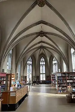 Die heutige Zentralbibliothek besteht aus vier Gebäuden: dem Predigerchor, dem Frontgebäude des Altbaus, und den 1994 erbauten Lesesaal und Verwaltungstrakt. Der Predigerchor wurde 1325 und 1350 in zwei Etappen in gotischem Stil erbaut und war Teil des Predigerklosters. Die Blütezeit im frühen 14. Jahrhundert erlaubte es den Dominikanern mit dem Chor ein anspruchsvolles Bauvorhaben in Angriff zu nehmen. Allerdings unterbrachen die bereits Mitte des 14. Jahrhunderts einsetzenden politischen Unruhen das Bauvorhaben mehrmals und der Chor wurde schliesslich in klar reduziertem Anspruch vollendet.[18]