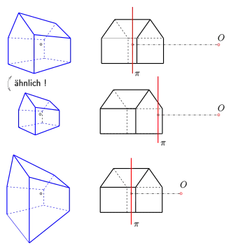 Das Bild mit Variationen eines Hauses zeigt die Bedeutung der wesentlichen Parameter Hauptpunkt, Distanz und Augpunkt. Hält man den Augpunkt fest und schiebt die Bildtafel auf den Augpunkt zu, d. h. man verkürzt die Distanz, so wird das Bild lediglich verkleinert auf ein zum ersten Bild ähnliches Bild. Winkel bleiben dabei erhalten. Hält man dagegen die Bildtafel fest und schiebt den Augpunkt auf den Hauptpunkt zu, d. h. auch hier wird die Distanz verkürzt, so entsteht ein Bild mit einer neuen Bildwirkung. Das Bild ist nicht mehr ähnlich zum ersten Bild. Entsprechende Winkel sind nicht mehr gleich. Eine Verschiebung des Hauptpunktes entlang der Gerade bewirkt lediglich eine Verkleinerung oder Vergrößerung des Bildes. Eine Verschiebung des Augpunktes entlang bewirkt eine wesentliche Veränderung des Bildes.