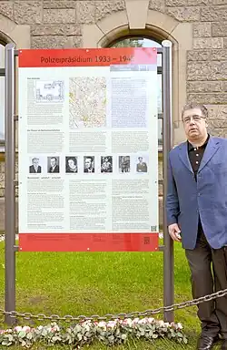 Oswald Marschall, leitender Referent vom Zentralrat Deutscher Sinti und Roma, hier vor der am 4. Mai 2015 enthüllten Erinnerungs- und Gedenktafel vor dem Hauptgebäude der Polizeidirektion Hannover