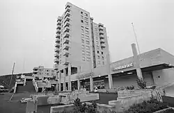 In der über eine Treppe erschlossenen ersten Etage befindet sich der erhöht gelegene «Dorfplatz», der als Begegnungszentrum dienen sollte. Er liegt zwischen dem 39 Meter[3] hohen Wohnhochhaus, das auf elf Etagen 45 Wohnungen umfasst und dem Hotelbau mit 22 Zimmern, Festsaal, Restaurant und Sitzungszimmern. Auf der anderen Seite des Wohnhochhauses befindet sich ein Parkdeck. Ebenfalls über den Dorfplatz zugänglich ist die Quartierbibliothek.[4]