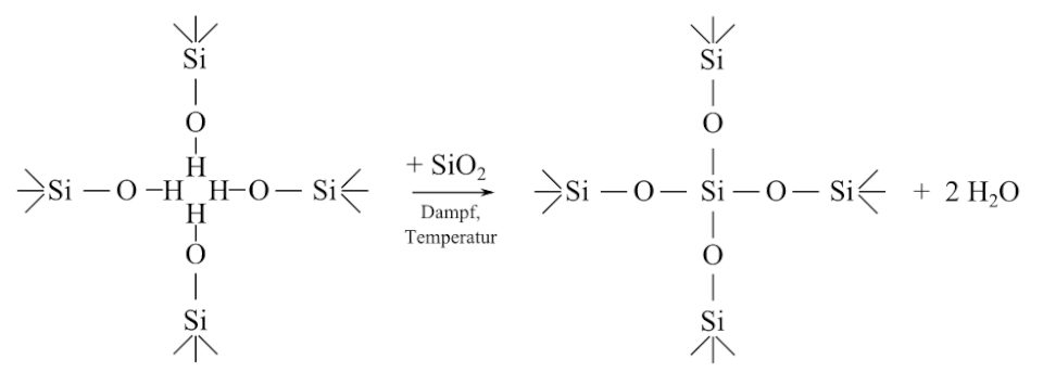 Unter diesen Bedingungen findet eine Umstrukturierung des Zeolithgerüstes unter Beseitigung der entstandenen Fehlstellen statt. Diese werden durch nachrückendes Silizium besetzt: