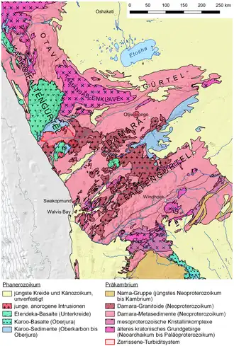 - ↑ a b David R. Gray, David A. Foster, Ben Goscombe, Cees W. Passchier, Rudolph A. J. Trouw: 40Ar/39Ar thermochronology of the Pan-African Damara Orogen, Namibia, with implications for tectonothermal and geodynamic evolution. In: Precambrian Research. Oktober 2006. doi:10.1016/j.precamres.2006.07.003 (alternativer Volltextlink: ResearchGate).