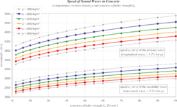 In Beton liegt die Primärwellengeschwindigkeit zwischen 3500 und 4600 (C12/15 bis C100/115). Bei unbekannter Betondruckfestigkeit kann in erster Näherung von = 4000 ausgegangen werden. Der Zusammenhang zwischen Wellengeschwindigkeit, Wellenlänge und Frequenz ist gegeben durch: