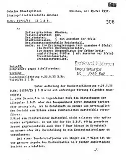 Gleichzeitig wurde eine „Anpassung an die nationalen Verhältnisse“ vorbereitet. Mit einem Memorandum vom 26. April 1933 teilte die Leitung der Zeugen Jehovas die Internationale Bibelforscher-Vereinigung in die Norddeutsche Bibelforschervereinigung und Süddeutsche Bibelforschervereinigung auf.[8] Den Bestimmungen entsprechend, wurden die jeweils zehn Posten ausschließlich mit so genannten „Ariern“ besetzt.[9]