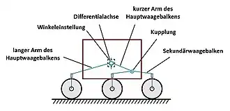 - 2 Kupplungen, auf jeder Seite eine, mit denen das Gelenk zwischen dem kurzen Arm des Hauptwaagebalkens und dem Sekundärwaagebalken individuell verriegelt oder gelöst werden kann