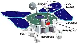 - Wetterstation (MCS): Temperatur: −120 °C bis +50 °C bei einer Auflösung von 0,1 °C, Luftdruck: 1–1500 Pa bei einer Auflösung von 0,1 Pa,[30] Windgeschwindigkeit: 0–70 m/s bei einer Auflösung von 0,1 m/s, Windrichtung: 0°–360° bei einer Auflösung von 5°, Mikrofon: 20 Hz–20 kHz mit einer Empfindlichkeit von 50 mV/Pa.[31] Die Temperatur- und Luftdruck-Sensoren befinden sich rechts vorne an der Oberseite des Gehäuses, am unteren Ende der UHF-Rundstrahlantenne, der Windmesser und das Mikrofon unter dem linken Objektiv der topografischen Kamera auf dem Mast.[32][7]
