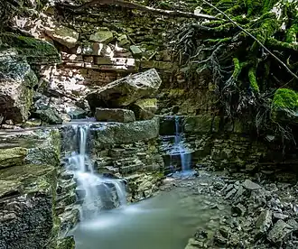 Die bei den Zuflüssen erwähnte Doline etwas östlich der Knicks des rechten Oberlaufs, in der zuweilen ein kleiner Bach verschwindet[LUBW 9], zeigt Verkarstung des dort nur wenige Meter unter der Geländeoberfläche beginnenden Oberen Muschelkalks an. Diese relative Lage im Schichtenprofil ist typisch für die Dolinen der Region.