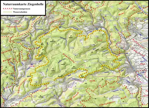 Naturräumliche Karte des Ziegenhellenmassivs; mit im Ausschnitt enthalten sind die „Konkurrenzberge“ Kahler Asten (842 m) im westlichen Norden und Bollerberg (758 m) im Nordosten als Dominanz-Nehmer und -Geber.