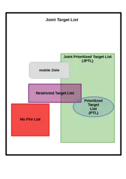 - Phase 2 – Erarbeitung von Ziellisten (englisch Target Development). Für die Erarbeitung von Ziellisten werden zuerst Fähigkeiten und Schwachpunkte des Gegners analysiert und seine Machtzentren (englisch Centres of Gravity (CoG)) identifiziert. Auf Grundlage der dabei gewonnenen Erkenntnisse wird eine erste Auswahl von Zielen getroffen. Diese ausgewählten Ziele werden anhand aller vorliegender Informationen validiert und in einer gemeinsamen Zielliste (Joint Target List (JTL)) zusammengefasst. Die JTL ist die Grundlage für alle weiteren Bearbeitungsschritte. In sie fließen auch die Zielvorschläge (englisch Target Nomination Lists (TNL)) der unterstellten Kommandeure ein. Die JTL enthält alle denkbaren Ziele, auch jene, die nicht angegriffen werden dürfen. Diese werden zusätzlich in einer separaten No-strike List dokumentiert. Ziele, die einem besonderen Vorbehalt und einer ausdrücklichen Freigabe unterliegen, werden zusätzlich in die Restricted Target List aufgenommen. Die zulässigen Ziele werden priorisiert und in der Joint Prioritized Target List (JPTL) zusammengefasst.