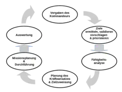 - Phase 1 – Befehlsgebung und Richtlinien des Kommandeurs. Als erster Schritt im Prozess der Zielplanung wird die Planungsrichtlinie des operativen Führers ausgewertet und in einem iterativen Prozess zusammen mit den Kommandeuren der einzelnen Komponenten einer Streitmacht (Land-, Luft-, Seestreitkräfte etc.) in Einzelaufträge heruntergebrochen.