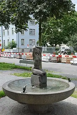 Auf der Aegerten befand sich einst am östlichen Ende der Grünanlage ein kleiner Obeliskbrunnen. 1946 wurde er durch den neuen Zierbrunnen ersetzt, den die Bildhauerin Hedwig Haller-Braus geschaffen hatte. Er besitzt einen runden Trog mit Sockel und ist mit der Figur einer knienden, nackten jungen Frau geschmückt. Als Sprudel dienen zwei wasserspeiende Fische aus Bronze, von denen einer allerdings nicht mehr original ist: 1979 wurde der eine der beiden Fische gestohlen und durch einen Abguss des verbliebenen ersetzt. Der Brunnen ist seit 1964 ans Verteilnetz angeschlossen.[1]