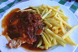 Zigeunerschnitzel ist in der österreichischen und deutschen Küche ein Gericht aus Naturschnitzel vom Kalb mit Paprikasauce bzw. Zigeunersauce.[1] Es stammt ursprünglich aus Ungarn und gehörte zur gehobenen Küche der k. und k. Monarchie.[2] In der bürgerlichen Küche werden unter dieser Bezeichnung auch panierte Schweineschnitzel mit Zigeuner- oder Paprikasauce angeboten.