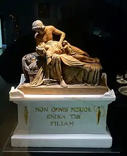 Die dargestellte Szene spielt sich auf einer antiken Bettstatt ab, die auf einem weißen, aus Alabaster gefertigten Sockel steht, der einem antiken Grabstein von länglicher, rechteckiger Form nachempfunden ist.[3] Der nackte, sitzende Ehemann beugt sich mit schmerzlichem Gesicht über die auf seinem Schoß liegende Frau, deren linker Arm schon leblos herabgesunken ist (der Arm fehlt heute ab Mitte des Oberarms). Mit der linken Hand hält sie noch ihr lebloses Kind. Der Mann prüft mit der linken Hand, ob das Herz seiner Gattin noch schlägt. Ihr letzter Blick gilt dem Ehemann, und sie scheint ihm als letzte Botschaft sagen zu wollen, was in goldenen Lettern in lateinischer Sprache auf dem Sockel geschrieben steht: NON OMNIS MORIOR. ENIXA TIBI FILIAM (deutsch: Nicht ganz sterbe ich, denn ich habe Dir eine Tochter geboren).[1] Das Kind wird in einer zeitgenössischen Beschreibung als lebend beschrieben, das zur Brust der Mutter klettert und die Milch einfordert, die es nie bekommen wird.[3]