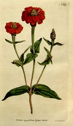 - Zinnie (Zinnia elegans Jacq., Syn.: Zinnia violacea Cav.): Sie ist in weiten Gebieten Mexikos verbreitet.[2] Ob der gültige Name Zinnia elegans Jacq.[2] oder Zinnia violacea Cav.[3] ist, wurde kontrovers diskutiert. Seit 2012 ist aber der Name Zinnia elegans konserviert.[2]