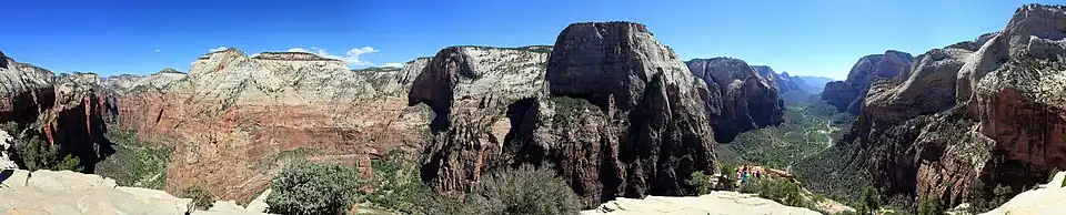 Angels Landing ist eine 1763 m hohe Felsformation, die über einen anstrengenden und teilweise ausgesetzten 8 km langen Weg über 450 Meter Höhenunterschied zu erreichen ist. Der Pfad ist teilweise äußerst schmal, aber mit Ketten gesichert, und bietet spektakuläre Ausblicke.