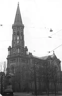 Aus Dankbarkeit, einem Attentat in Baden-Baden entgangen zu sein, stiftete im Jahr 1861 der damalige König und spätere Kaiser Wilhelm I. 10.000 Reichstaler für den Bau einer Kirche in dem damals noch zur St.-Elisabeth-Gemeinde gehörenden, aber im Zuge des Baus des Wilhelminischen Rings schon dicht besiedelten Gebiet. Nach einigen Auseinandersetzungen zwischen dem Berliner Konsistorium und dem Magistrat von Berlin konnte 1866 mit dem Bau begonnen werden. Wegen Geldmangels ruhten die Bauarbeiten ab Ende 1868, doch eine weitere Stiftung des Königs ermöglichte 1872 die Fertigstellung der Bauarbeiten. Die Kirche ist im Stil der Neoromanik errichtet, als Backstein-Terrakotta-Bau im Stil des Berliner Historismus mit gelben Blendsteinen aus der Cement- und Tonwarenfabrik Hermsdorf. Sie hatte 1424 Sitzplätze, 562 davon auf der Empore. Die Baukosten (ohne Grundstück und Bauleitung) lagen bei 373.364 Mark[2] (kaufkraftbereinigt in heutiger Währung: rund 3,36 Millionen Euro). Zur Ausstattung gehörte auch eine Orgel von Wilhelm Sauer mit 30 Registern auf zwei Manualen und Pedal.[3]