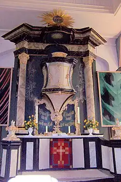 Vor der Wand der südwestlichen Schmalseite des Baus steht ein typisch protestantischer Kanzelaltar in Rokokoformen.[6] Der Kanzelaltar ist durch Säulen und Pilaster gegliedert mit der Kanzel in der Mitte.[6] Den Kanzelaltar krönt das Tetragrammaton יהוה JHWH und der Landesherr ließ sich links vom Altar mit den in einer Rocaille ornamentierten Initialen GR (d. h. lateinisch Georgius Rex, im Photo verdeckt durch ein Gemälde einer Ausstellung) verewigen.[6] Rechts vom Kanzelaltar findet sich das Wappen des brem-verdenschen Amtes Osterholz. Diese drei Symbole widerspiegeln geistliche und weltliche Herrschaft.[11]