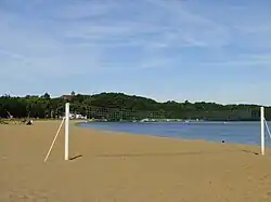 Nach dem Zweiten Weltkrieg wurde die Straßenbahnverbindung zum Seeufer in Zippendorf wieder aufgenommen und 1963 zweigleisig und mit einer Wendeschleife ausgebaut. Der Besucherandrang machte 1949 und 1965 Neuaufschüttungen des Strandes erforderlich. Durch die Errichtung des Plattenbaugebietes Großer Dreesch wurde der Badestrand 1982 erneut vergrößert, so dass jetzt bis zu 4000 Badegäste gleichzeitig Platz fanden. 1984 wurde die Ferieneinrichtung Fritz Reuter des FDGB mit 753 Betten und einer eigenen Schwimmhalle eröffnet. Sie wurde jährlich von 26.000 Erholungssuchenden genutzt.[13] Nach der Wende wurde die Schwimmhalle abgerissen und die Gebäude zur Seniorenwohnanlage umgebaut.[14] Die direkte Straßenbahnlinie bis an den Zippendorfer Strand wurde noch bis 1977 betrieben. Eine Sanierung erwies sich als zu kostspielig, außerdem existierte seit 1974 die leistungsfähigere, nicht auf Straßen verlaufende Verbindung zum Großen Dreesch mit der dortigen Wendeschleife Zentrum, dem heutigen Berliner Platz, von wo aus der Strand ebenfalls zu erreichen war.[15]