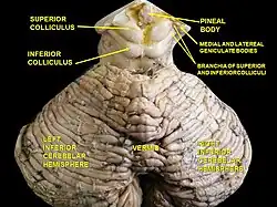 Die Zirbeldrüse oder lateinisch Glandula pinealis, kurz Pinealis oder Pinea – nach der Form der Zapfen der Zirbelkiefer (Pinus cembra) bezeichnet[1] –, anatomisch auch Epiphysis cerebri oder kurz Epiphyse genannt (weitere synonyme Fachausdrücke siehe unten), ist eine kleine, häufig kegelförmige endokrine Drüse auf der Rückseite des Mittelhirns im Epithalamus (einem Teil des Zwischenhirns).