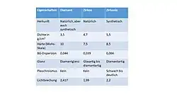 Auch Experten können gute Zirkoniasteine nicht durch Augenschein, sondern erst durch eine Messung des Wärmeleitwerts von Diamanten unterscheiden: Während Diamanten besonders gut wärmeleitend sind, leiten Zirkonia Wärme besonders schlecht (siehe Zirconiumdioxid, Verwendung). Weitere relativ einfache und durch nichtdestruktive Messverfahren zu ermittelnde Unterschiede zum Diamanten sind die unterschiedliche Lichtbrechung (Brechungsindex Zirkonia 2,18; Diamant 2,42) und Dichte (Zirkonia 5,8 g·cm−3, Diamant 3,5 g·cm−3).[12]