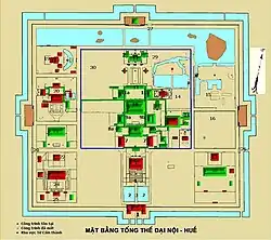 Nach und nach wurden weitere Gebäude, Höfe und Gärten in der im Südosten der Zitadelle liegenden Verbotenen Stadt ergänzt. Die Herrschaft des Kaisers dauerte bis zur Mitte des 19. Jahrhunderts. Bis dahin umfasste das Innerste, die dem Herrscher und seiner Familie vorbehaltene Verbotene purpurfarbene Stadt viele Gebäude und mehrere hundert Räume. Die Bausubstanz litt unter Termiten und Zyklonen, blieb aber imposant. Bei der Schlacht um Huế während der Tet-Offensive flogen die US-Streitkräfte gezielte Bombenangriffe gegen die Zitadelle und die dort in Stellung gegangene nordvietnamesische Armee und die Vietcong. Bei diesen Kämpfen, welche bis zum 24. Februar 1968 andauerten, wurde die alte Kaiserstadt vollständig zerstört.[2] Lediglich die Tempel Thái Hòa und Cần Thanh sowie Thế Miếu und Hiển Lâm Các blieben erhalten. In den steinernen Umfassungsmauern sind noch heute Spuren dieser Schlacht zu finden. 1993 wurde die Zitadelle von Hue ein UNESCO-Welterbe. Für 2015 sind umfangreiche Restaurierungsarbeiten geplant.[3]