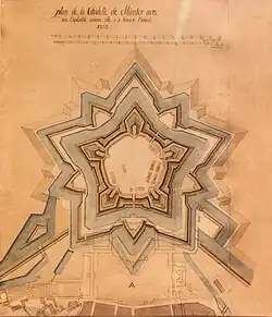 Fürstbischof Christoph Bernhard von Galen errichtete die Zitadelle von April 1661 bis Mai 1662. In der Form eines Fünfecks schützte sie sowohl vor äußeren Feinden als auch vor der Bevölkerung der Stadt. Die Westflanke der Stadtmauer aus der Zeit der Staufer musste entfernt werden. Um die Stadt mit der Festung zu verbinden, wurden der nördliche und der südliche Mauerverlauf bis zur Zitadelle verlängert.[1] Dies war die erste Stadterweiterung seit dem Bau der Stadtmauer. Zwischen Zitadelle und Stadt entstand der spätere Schlossplatz, der als Esplanade diente. Der „große Platz“ hieß später Neuer Platz oder Neuplatz.[2] In der Zitadelle befanden sich Truppenunterkünfte, Stallungen, Magazine, ein Zeughaus und eine Kapelle. 1662 waren auf ihr 450 Reiter stationiert. Die Zitadelle erlebte nur einen Kriegseinsatz im Siebenjährigen Krieg und geriet 1759 unter schweren Beschuss. Durch die Höhe ihrer Wälle und die Lage vor der Stadt war sie für Feuerwerke bestens geeignet.[3]