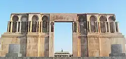 Das Eingangsgebäude ist kreuzförmig, wobei über dem nördlichen- und südlichen Arm jeweils ein Tonnengewölbe und über dem westlichen- und östlichen Arm jeweils eine Kuppel liegen. Reste von Fenstern deuten darauf hin, dass der Hauptraum mit einer Kuppel überdacht war, die Ende des 20. Jahrhunderts aus Holz rekonstruiert wurde.[22] Die Nischen im Innenraum sind mit Blattreliefen verziert. Dort dargestellt sind Eichen- und Weinlaub sowie einige Muster, wie Rosetten, Kleeblättern und Vierpässe.[23]