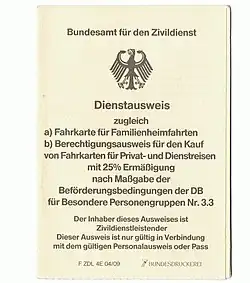 Der Zivildienstausweis diente für die sogenannten Familienheimfahrten als Fahrausweis in Zügen der Deutschen Bahn. Ebenso erhielt man mit ihm eine Vergünstigung von 25 % auf bestimmte andere Fahrausweise. Ferner wurden dem Zivildienstleistenden gegebenenfalls Ermäßigungen bei der Benutzung öffentlicher Einrichtungen oder mancher Dienstleistungen ermöglicht.