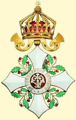 Bis 1908 wurde das Ordenszeichen (1. Modell) von einer runden Fürstenkrone überragt. Mit der Erhebung zum Königreich kam eine eckige Zarenkrone (2. Modell) zur Anwendung.