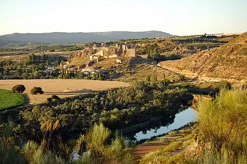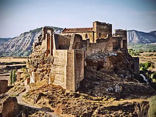 - Der Ursprung der Burg (castillo oder alcazaba) reicht wahrscheinlich bis ins 10. Jahrhundert zurück; auch westgotische Ursprünge werden ins Spiel gebracht. Sie thront auf einem Felsen, dessen unregelmäßige Formen sie aufnimmt und sogar noch verstärkt. Mehrere Eingänge (z. T. mit Hufeisenbögen) führen auf einen Innenhof, dessen Mitte von einer einschiffigen romanischen Kirche mit Krypta eingenommen wird. In der Kirche haben sich das Rippengewölbe der Apsis und einige mit abstrakten Mustern verzierte Kapitelle erhalten.[6][7][8]