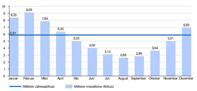 Der monatliche mittlere Abfluss (MQ) der Zorn in m³/s, gemessen an der hydrologischen Station Waltenheim-sur-Zorn