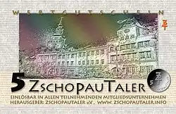 Vom 17. August 2007 bis 28. Februar 2014 waren in der Region Mittweida, Frankenberg, Waldheim, Hainichen, Flöha, Augustusburg und Zschopau 379.916 Euro als Regionalwährung ZschopauTaler (ZPT) in Umlauf.[21] Es war eine Schwundwährung: Auf jeden Schein war ein Verfallsdatum gedruckt, bis zu dem er an Wert verlor und zu dem er absolut wertlos wurde.[22][23] Ein Zschopautaler hatte 2011 etwa einen Wert von einem Euro. Er warf keinen Zins ab, vielmehr kostete der Rücktausch in Euro fünf Prozent Gebühr.[23]